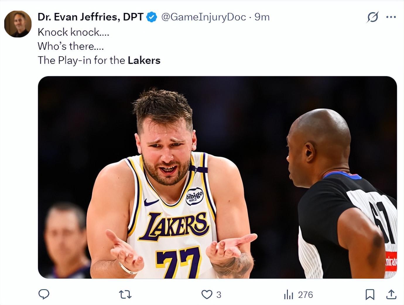 埃文-杰里弗斯晒出东契奇摊手的一幕写道:敲门,谁在那儿?湖人的季后赛对决吗?