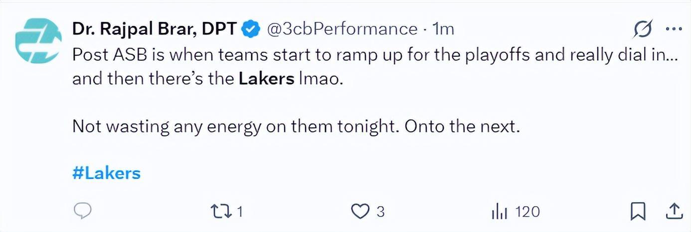 赛后专家Rajpal 写道:在常规赛的最后阶段各队都在为季后赛做准备,全力以赴。。。。而湖人真实让人捧腹大笑。我们不该对他们抱有期待,接着往下走吧。