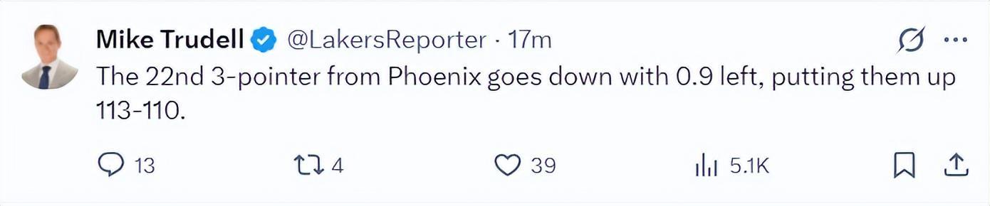 湖人队记迈克-特鲁戴尔:在终场前0.9秒湖人居然让残阵太阳命中第22个三分球。